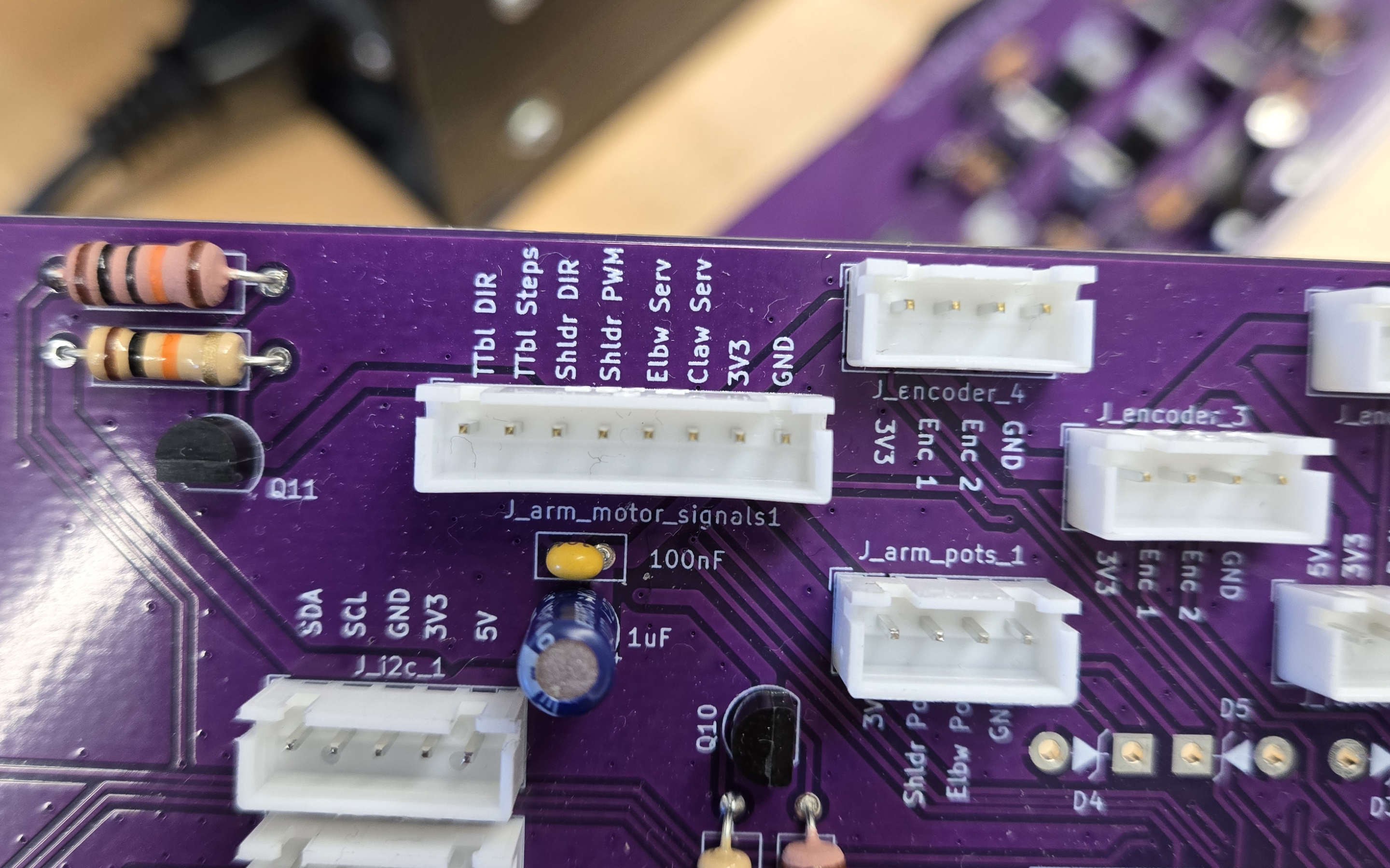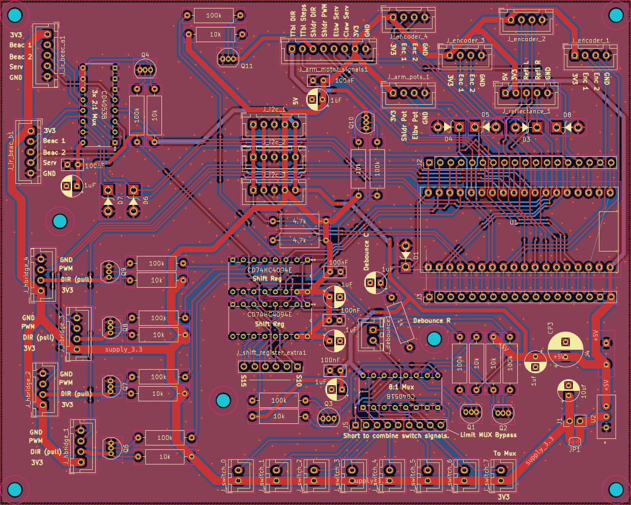 For the software, we wrote over 4,000 lines of firmware to control all the motors, read all the sensors, and control the robot (e.g. moving the arm to certain positions, follow a black line of tape on the field, etc). We used PID controllers all over the place, for example our wheels were velocity PID controlled using magnetic encoders, one of our arm joints was a DC motor with a potentiometer attached which would use PID control to go to whichever angle, and the tape following algorithm changed the rate of turning using a PID controller too.