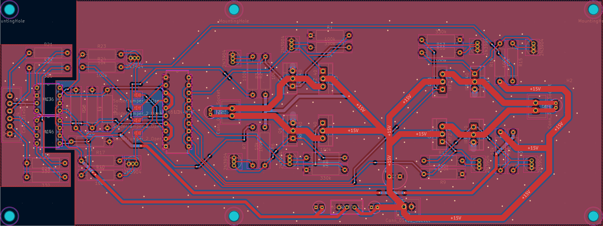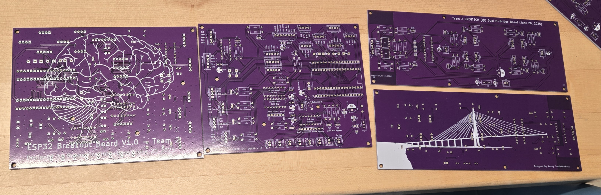 I designed two PCBs (and made numerous one-off proto boards); I designed an H-Bridge board and a breakout board for our ESP32 microcontroller (see below images). The KiCAD files are available here.