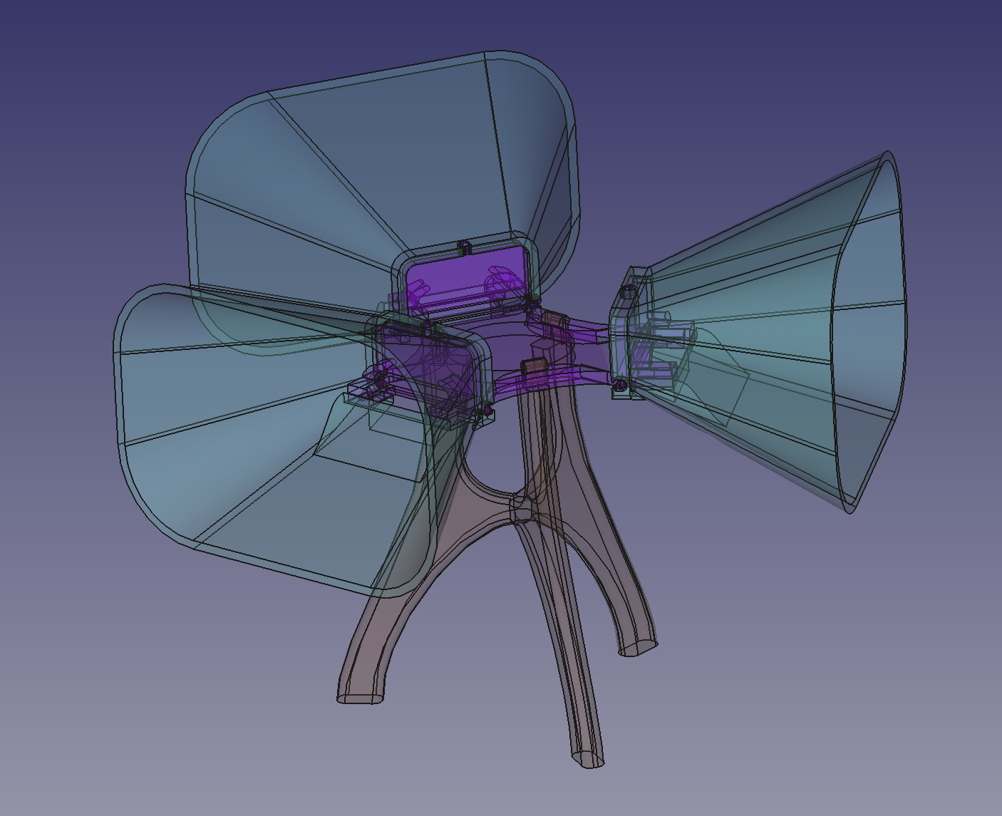 I had already bought some omnidirectional USB microphones a while back for this project, so I adapted them with 3D printed cones to directionally bias them. I also 3D printed a mount that holds the microphones and the cones above the ground:
