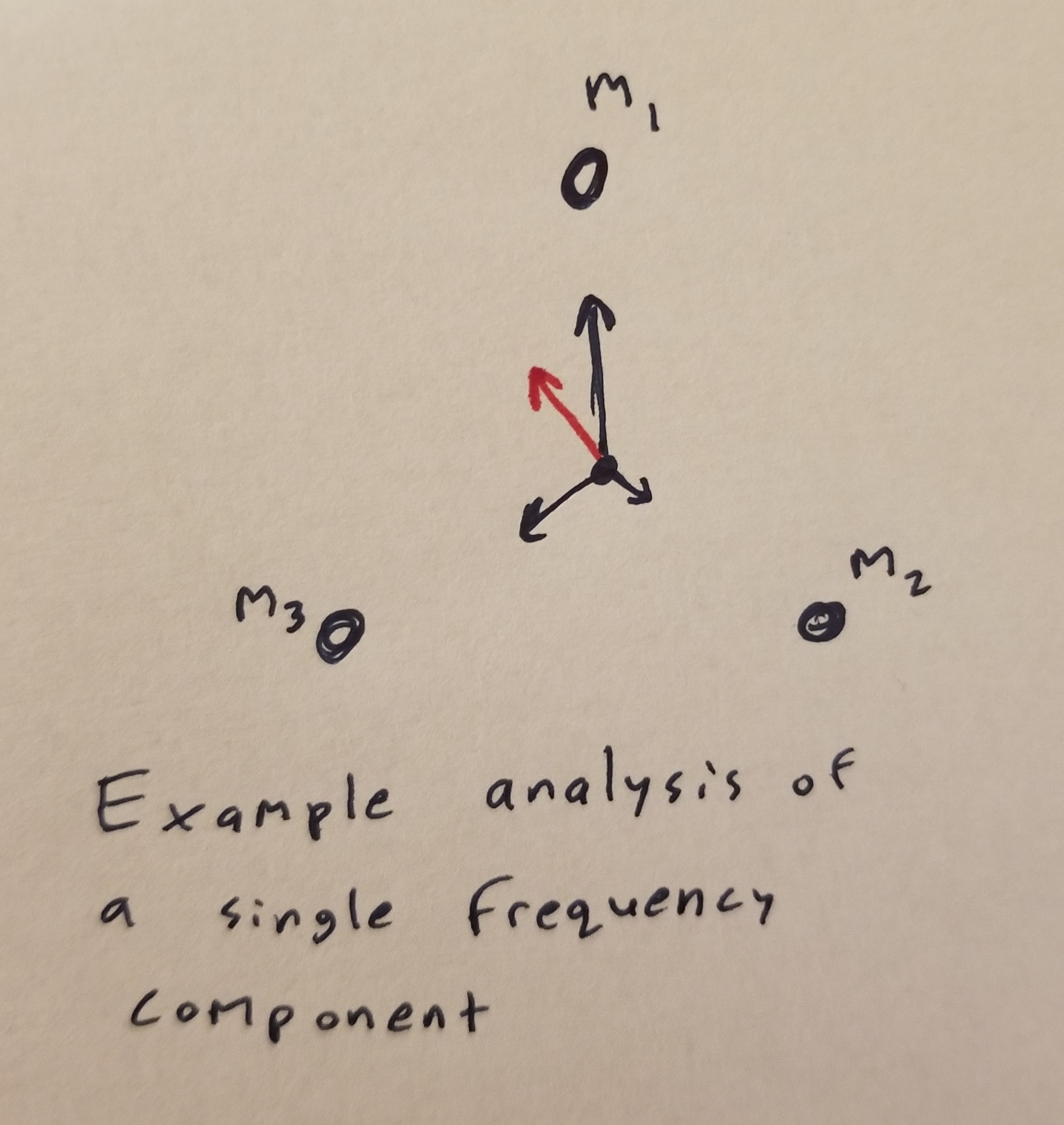 Consider the above image. The frequency component has highest intensity at mic 1 (\(m_1\)), medium intensity at mic 3 (\(m_3\)), and lowest intensity at mic 3 (\(m_3\)); the microphones are illustrated as dots. The black vectors are the vectors that WaveTracer creates to represent the frequency components as detected by each microphone. These vectors are added to get the red vector, which represents the overall direction and magnitude of the frequency component being analyzed. Note that if all the magnitudes of the black vectors are the same, the red vector will have magnitude 0; essentially, the red vector’s represents not quite the magnitude of this frequency, but the directional magnitude (how much it is biased in a certain direction).
