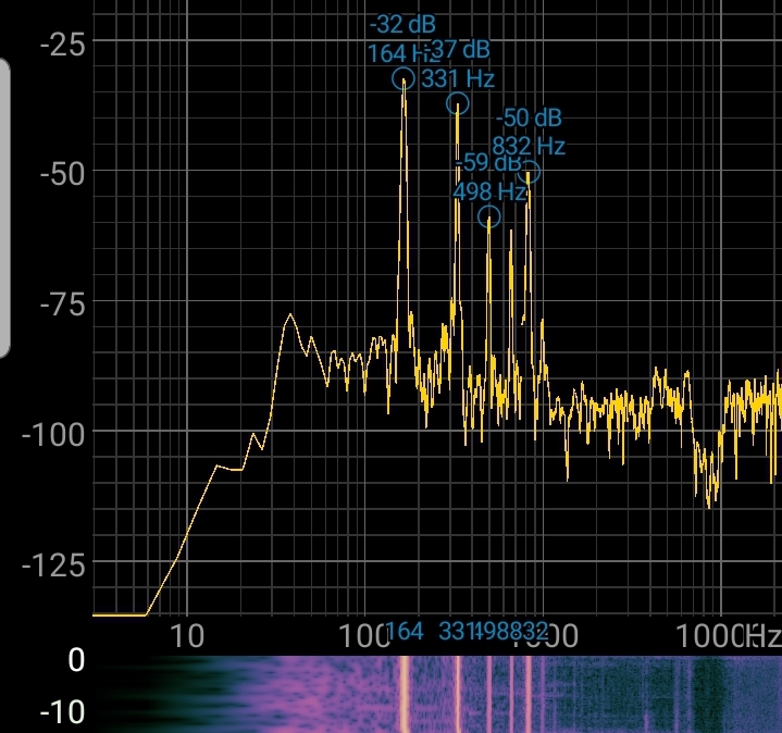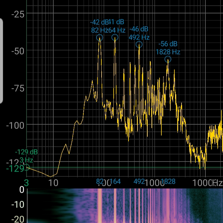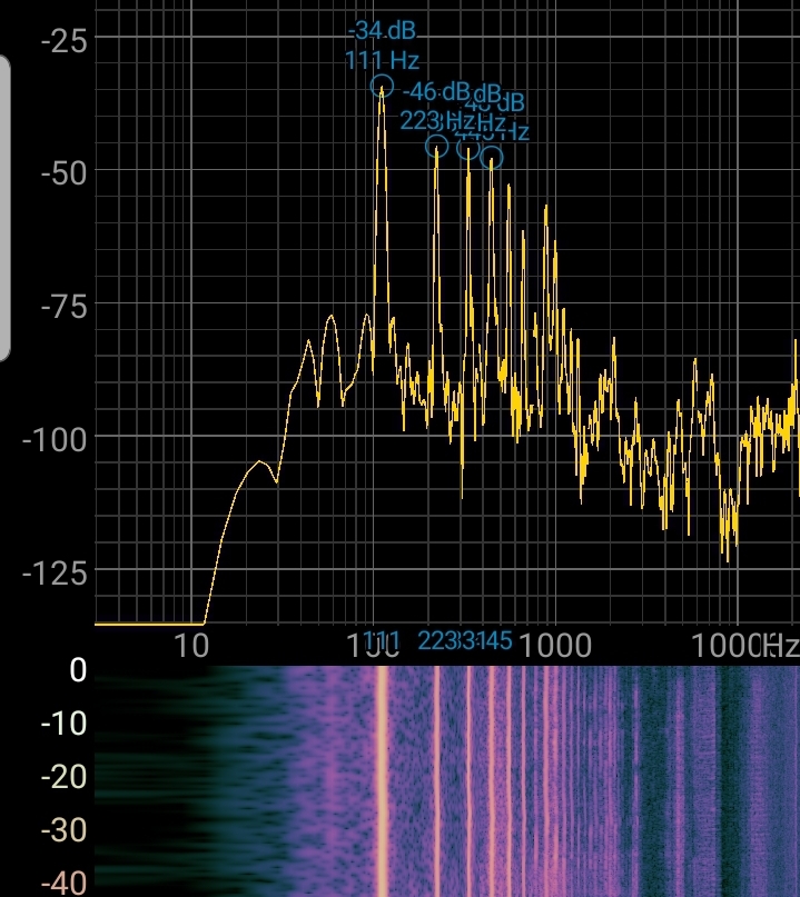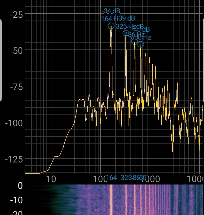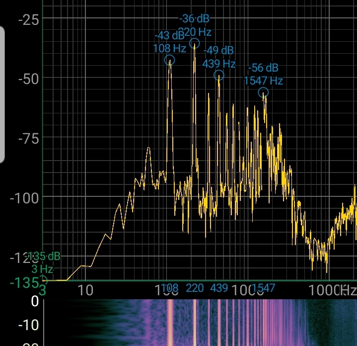 To illustrate the difference between these two, consider the following FFT plots of my keyboard’s piano sound and my voice; note that the horizontal axis is frequency in Hz, and the vertical axis is intensity in decibels.